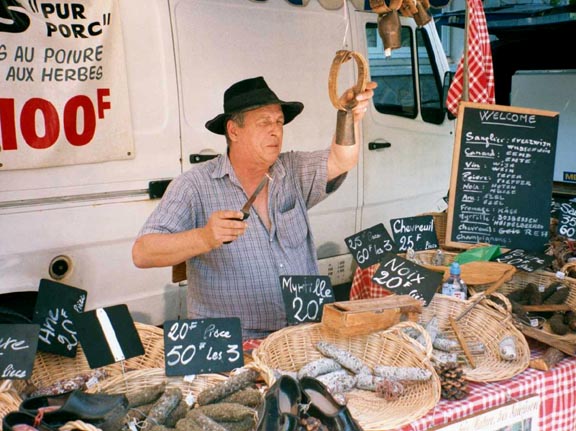 - saucisson: sausage, usually refers to a large smoked sausage (e.g., saucisse, small sausage; saucisse aux herbes ou au chou, fresh sausage made with meats, vegetables and herbs; saucisson d'Arles, regional dry sausage)